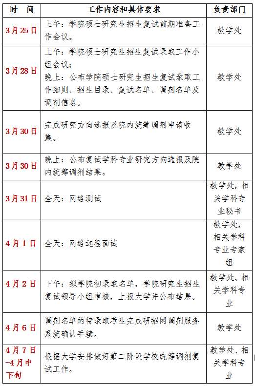 确定学院招生复试录取工作细则→确定学院复试名单→复试资格审查→研究方向选报、院内统筹调剂→网络调试→网络远程面试→待录取。