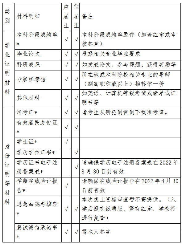 (一)复试资格审查:根据大学方案,所有入选学院复试名单的考生均需进行线上资格审查(材料应为扫描件或照片电子版, jpg或pdf格式,线下资格审查在入学后进行),资格审查材料不齐全或审查不合格的考生不予复试。考生需提供材料见下表: