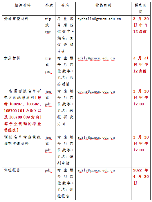 以上审查材料电子版压缩为一个文件(zip或rar格式),并以“考生编号后四位数字+姓名:复试资格审查”格式命名(如张三,考生编号为:105720987608888,即其邮件命名为:“8888+张三:复试资格审查”),请于3月30日中午12点前发至邮箱:zyahello@gzucm.edu.cn。