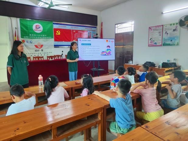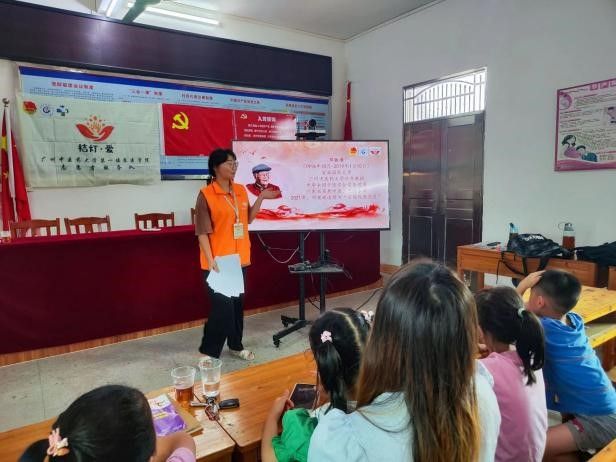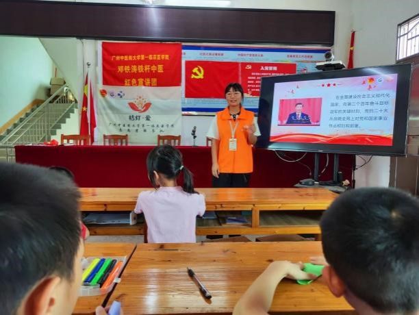此外,队伍注重思想引领实践活动。在义教活动中,志愿者结合红色电影展播开展党团知识宣讲以提高孩子们的思想素质,培养其对祖国、对党的热爱与敬佩,开展“邓铁涛铁杆中医红色故事”宣讲以赓续红色精神薪火,传播优秀中医药文化。