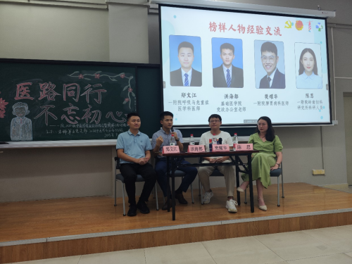 随后,是同学们满怀期待的职业榜样人物经验交流环节。洪海都、樊耀华、郑文江、陈思四位优秀的前辈结合自身的专业学习和职业成长经验,耐心细致了解答了同学们现阶段关心关切的问题。发表了7篇SCI论文、7篇中文核心期刊论文的郑文江师兄用很“接地气”的语言和同学们交流如何兼顾临床和科研,如何成为一名优秀的临床医生;硕士毕业并成功跨行的洪海都师兄,以“过来人”的身份为同学们讲述了作为一名准毕业生该如何规划自己未来的职业生涯;脾胃病科博士毕业的樊耀华师兄就同学们比较关心的保研考研面试技巧和如何选择心仪的导师给予了解答;从事科研岗位的陈思师姐则分享了自己走上科研道路的心路历程,也为计划从事科研行业的同学提供了许多宝贵的意见。师兄师姐们毫无保留的经验分享,不仅解答了同学们心中的疑惑,更是为他们做好下一阶段的职业发展规划提供了宝贵的参考。