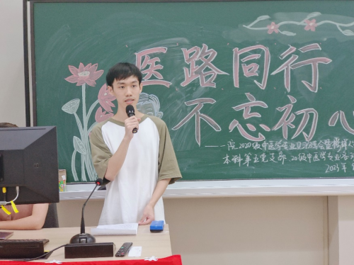 会议第一个环节,20级中医学八九年制专业的班长蔡嘉铬作为代表带领大家回顾了今年5月-8月期间各班级同学参加教学见习的概况。蔡嘉铬同学图文并茂的讲述,唤起了同学们对见习期间付出辛勤汗水收获成长喜悦的回忆。