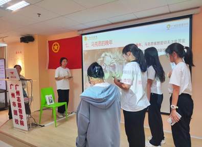 开班仪式后,广州市团校马艾斯老师为青马学员开展了首场培训——《马克思的光辉人生及经典著作导读》翻转课堂学习。马老师先以“马克思是一个怎样的人”为切入点引发青马学员思考,将马克思的人生经历划分为八个不同的人生主题——“马克思的童年时代”“马克思的大学时代”“马克思与恩格斯的友情”等,同时邀请学员们以小组为单位,通过话剧创作展演马克思的光辉人生。学员们充分运用网络资源及“青马工程”实训中心现场的卡牌书籍资料等,积极创作剧本。经过二十分钟紧张的准备,学员们如期呈现了一场精彩纷呈的马克思人生话剧盛宴。第一组学员们通过精彩的表演,再现了马克思在柏林大学求学时期,与同学们激烈辩论、在图书馆里孜孜不倦地研读哲学名著场景,生动演绎了“马克思的大学时代”;第二组学员们通过激昂的台词和饱满的情感,再现了马克思和恩格斯如何在艰难的社会环境中互相扶持、为追求真理而不懈努力,展现了伟大的理论创作过程中伟大的友谊;第三组学员以感人至深的表演细腻地描绘了马克思与妻子燕妮忠贞不渝的美好爱情……这场形式新颖的培训,让学员们更深入地了解了马克思的伟大事迹及不同时期的经典著作,进一步激发了学员们对共产主义理想的热爱和追求。