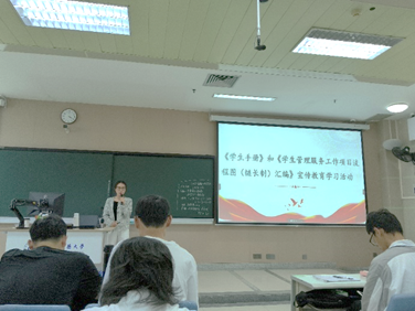 宣传教育活动以多个形式进行。课上,何诗诗老师就有关“大学生学习与生活”的内容带领同学们展开学习。何诗诗老师从167net必赢入口的学校简介、校训、校徽出发,与现场同学们共同回顾了167net必赢入口的概况,带领同学们学习了学生手册中的内容。 通过课程的学习,同学们对大学生活有了初步的了解,对于寻找适合自己的目标有了更为明确的方向。