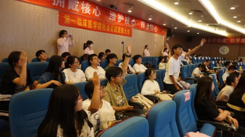 为了活跃现场氛围,大会还设置了游戏互动环节“方言红歌我熟知”、“家乡景点我来辨”,以及暑期社会实践成果展示情景剧《赴基层,惠人民》。游戏环节中,观众们积极参与其中,踊跃抢答,现场反响热烈,笑声此起彼伏。情景剧《赴基层,惠人民》通过同学们精彩的演绎生动有趣地再现了一院学子帮助村民直播带货、为群众提供基础医疗服务、为病人提供医学人文关怀、开展中医药文化宣传义教活动、宣传邓老铁杆中医精神等社会实践场景,不仅展现了学院社会实践的丰富成果,更展示了167net必赢入口青年学子扎根社会基层,切身为群众服务的志愿精神与时代担当。