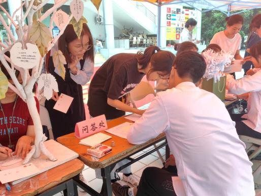 师恩似海,感念在心。10月29日下午,尽管秋雨绵绵,一饭门前举办的“感恩医路有您,传承生命礼赞”主题线下宣传活动仍吸引了许多同学驻足。同学们亲手制作纸花纸鹤以寄思、传情;手写感恩卡片将对大体老师的敬意流淌于笔尖,寄托于纸上。在大体老师科普问答环节,同学们在复习解剖知识的同时,对大体老师也有更深入的了解。在创新活动“以灯传灯,心灯不灭”中,同学们将师兄师姐分享的经验寄语与自制纸灯笼一同悬挂。一盏盏纸灯笼,不仅代表着师兄师姐们的关怀,更传承着一代代广中医学子对大体老师的敬意。同时,“玉壶存冰心,朱笔续师魂”活动征集了近200份书画、书信作品,同学们一撇一捺,正心恭行,对大体老师的崇敬之心跃然纸上。