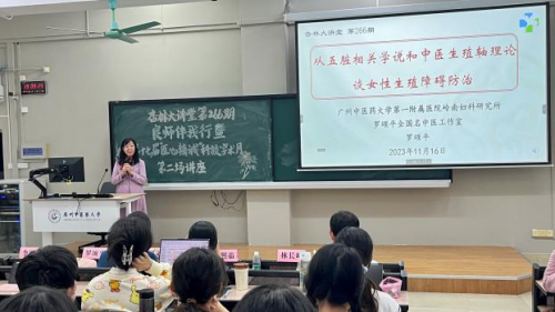 接下来,主持人介绍了本次活动的主讲嘉宾罗颂平教授。本次讲座,罗颂平教授以“从五脏相关学说与中医生殖轴理论谈女性生殖障碍防治”为主题,给同学们分享自己临床科研教学过程中的所思所想所论。讲座主要从五个角度展开,分别是“五脏相关学说的创新与超越”、“中医生殖轴:从经典到临床”、“元阴元阳乃生命之根”、“肾脾水土乃生殖之本”和“女性生殖障碍的中医防治策略”。罗颂平教授在讲授知识的过程中,多次提到我国中医妇科学家罗元恺教授,分享他从“医路”上的故事与经验,同学们深受启发。罗颂平教授在分享的过程中,时时与同学们互动,拉近了和同学们之间的距离,气氛轻松活跃。讲座结束后,现场多位同学就今天的讲座内容向罗颂平教授提出了相关问题,罗教授耐心详细地一一回答,让同学们更深刻地领略到中医妇科的魅力。活动结束后,在学生会工作人员的有序组织下,各位到场嘉宾和现场同学们合影留念,为今晚的活动画上完美的句号。