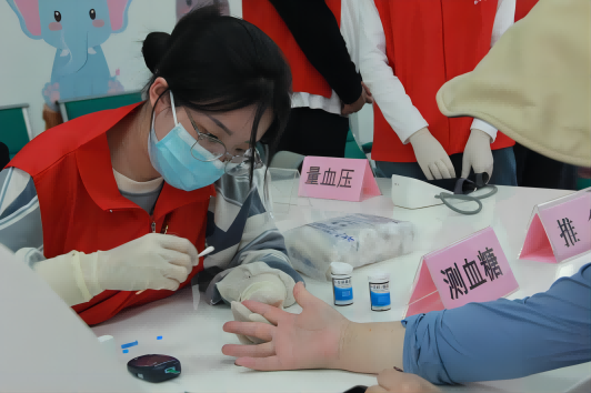 广东青年“百千万工程”突击队“红医传薪”队学生志愿者们为民众推按、量血压、测血糖等