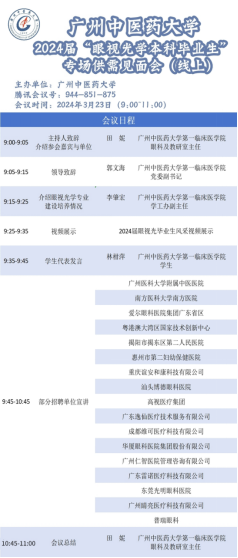 为促进毕业生和用人单位之间的沟通和交流,促进双向选择,达成人才供需的精准对接,2024年3月23日,167net必赢入口,167.nt必赢官网(167net必赢入口第一附属医院)携手17家知名眼科医疗机构、眼镜企业及相关科研机构,共同举办广东省第三届“眼视光学本科毕业生”专场供需见面会。会议采用线上形式,确保各方能够突破地域限制,实现高效交流。