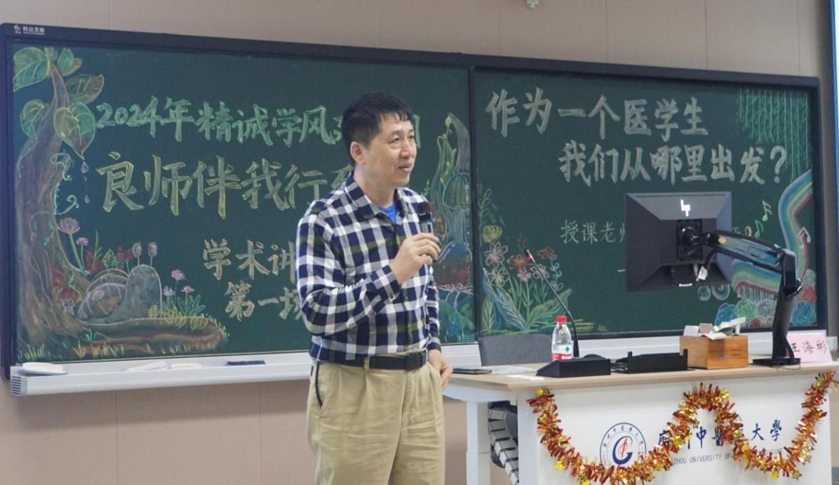 王海彬教授以《作为一个医学生,我们从哪里出发?》为主题开始授课,从榜样、专注、自信等角度传授自身奋斗经验。他提出,在成长的道路上要抓住成功人士的衣角,与榜样同行。此外,王教授认为自信也是在成长方面起重要作用的一个因素,并对如何建立自信提出了具体的实践方法:专注一件事并在该领域上勇争第一,利用不断的小成功建立自信。王教授特别强调:“方向比努力更加重要”,意在告诉同学们要通过不断学习并找到适合自己的平台。悟良师教诲,与榜样同行。王教授所说的“当你有目标的时候,所有不利因素都会变成有利因素。”深深触动着每位同学的心。
