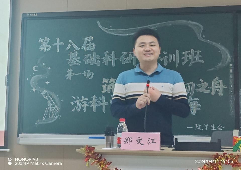 本次授课先由主持人介绍开展基础科研班的目的,“学海无涯,科技作舟”,为建立一个学习科研知识与经验的平台,奠定本科生科研基础,特开展此次活动。随后,陈小波老师为此次开课致辞,他强调了科研的重要性,鼓励同学们积极参与科研活动,营造一院浓厚的科研氛围。 接着,主持人介绍了主讲本次课程的郑文江博士。本次课程,郑文江博士以“本科生科研标书撰写”为主题,由“努力的方向比努力本身更重要”为起始,强调撰写标书的意义和认识标书撰写方法的重要性。再从标书选题切入点、撰写标书的思路和官方信息、资源的获取三个方面详细地进行指导。郑文江博士在授课的过程中,进行各方面知识的科普,以丰富的例子激励同学们去涉猎各个领域。同时去尝试,去思考,去发掘自己的科研潜能。讲座结束后,现场多位同学就今天的讲座内容对郑文江老师提出了相关问题,郑文江老师详细地一一解答,让同学们更加明晰撰写标书的方法。