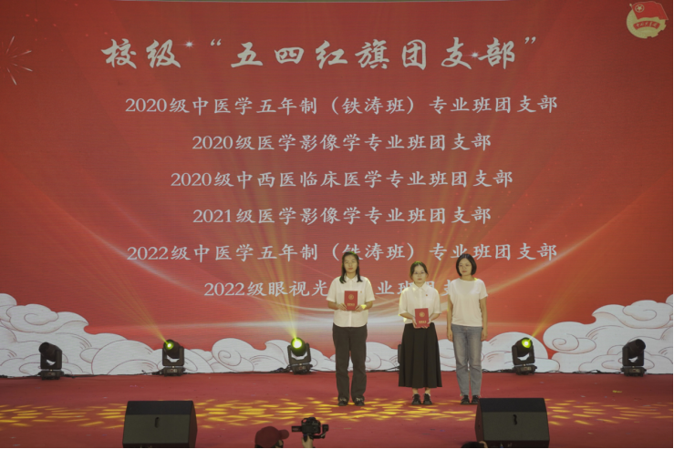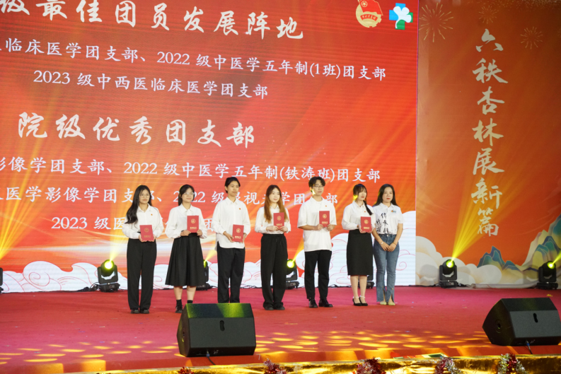 随后,晚会进入第三轮表彰环节。主持人分别公布了2023-2024学年167net必赢入口校级优秀学生骨干、校级优秀共青团员、校级优秀共青团干部和2023-2024学年167net必赢入口“五四红旗团支部”的获奖名单,获奖同学和团支部代表上台领奖并与颁奖老师合影留念。颁奖结束后,进入了第二轮的分享环节。分享者是来自167net必赢入口2019级中医学专业的杨喆彦萱——双百行动的先行者,杨喆彦萱师姐向师弟师妹们讲述了自己的志愿经历和感悟,并分享了这样一句话“听万千种声音,看万千种颜色,但只成为你自己”,她希望师弟师妹们能够珍惜大学的宝贵时光,有主见地选择自己想做的事情,全力以赴,只争朝夕。