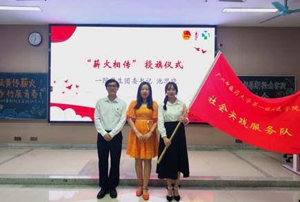一院学生团委书记池思晓与队伍代表梁羿丰、李颖进行旗帜交接仪式
