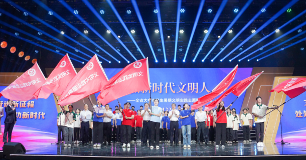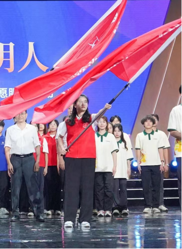 作为新时代里的中医学子,作为新浪潮下的中国青年,邓铁涛铁杆中医红色传承队志愿者们也将再次启航,前往开平再次探索邓老文化发展的新道路。在即将启程之际,铁涛传承队很荣幸收到广东省文明办的邀请,代表学校前往参加“做新时代文明人”——全省大中学生暑期文明实践志愿服务活动启动仪式暨主题演讲比赛展演并接受授旗。在现场代表们慷慨激昂,在宣誓人的带领下高声喊出了属于自己的奋斗篇章,代表云耀萱同学接过授旗并高高挥舞,表达了铁涛传承队队员们积极投身“百千万工程”建设的浪潮,让青春力量在乡村沃土中绽放的热血情怀。