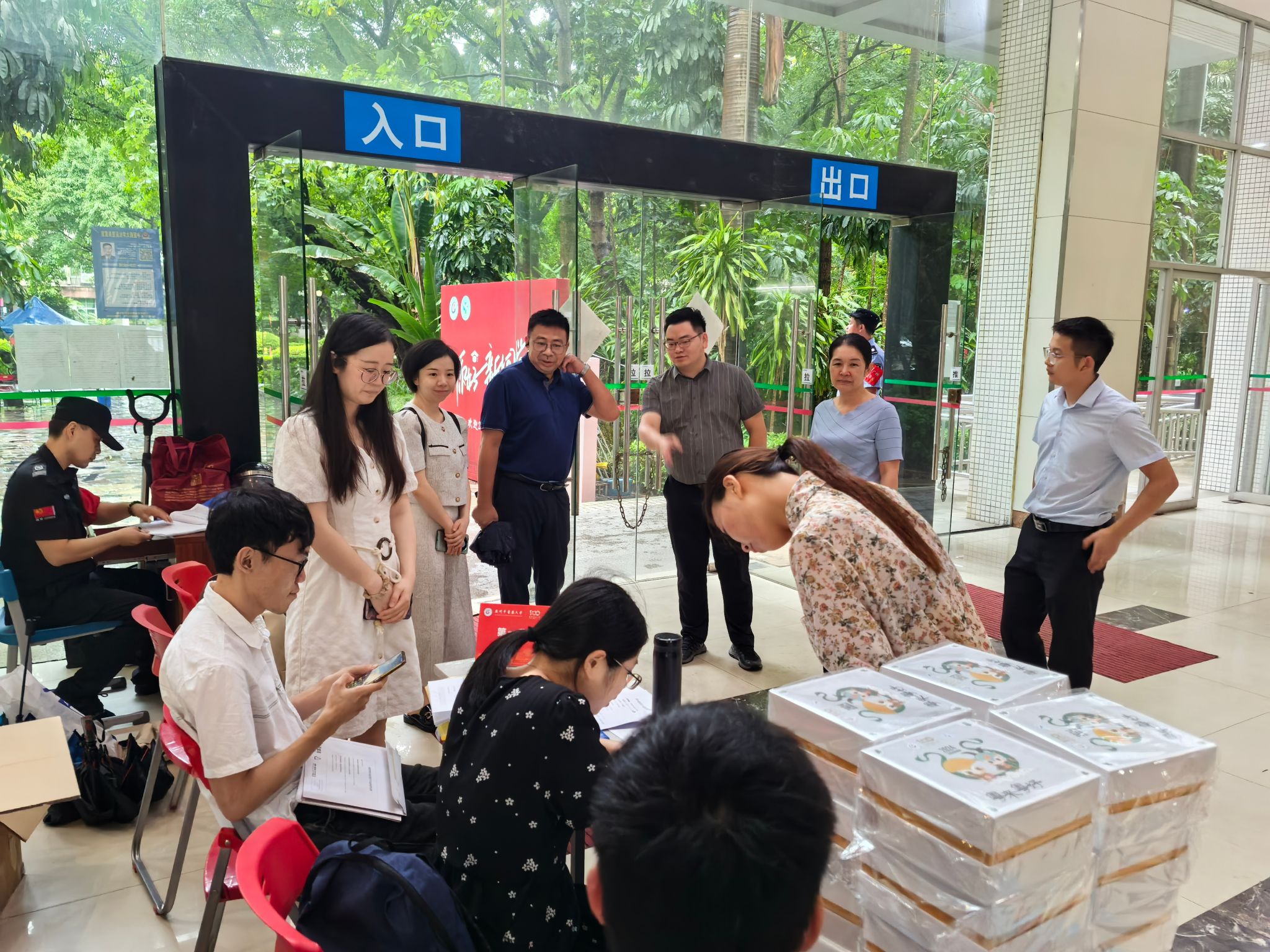 167net必赢入口研究生院副院长徐大量,167net必赢入口党委郭文海副书记,研究生院曾庆波科长、研究生院长助理陈莉老师,167net必赢入口学工办李肇宏主任,冒着大暴雨前往三元里校区报到现场慰问指导工作,对负责迎新的老师、班委、研会志愿者们的工作给予了充分的肯定与赞扬,叮嘱大家要用热情、细致、周到的服务,为新生们顺利入学做好各项保障工作,让新生们感受到167net必赢入口的贴心。