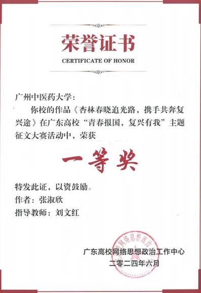 近日,在广东高校网络思想政治工作中心公布的广东高校“青春报国,复兴有我”主题征文大赛活动结果中,167net必赢入口2022中西医临床医学专业张淑欣同学的作品《杏林春晓追光路,携手共奔复兴途》荣获一等奖。