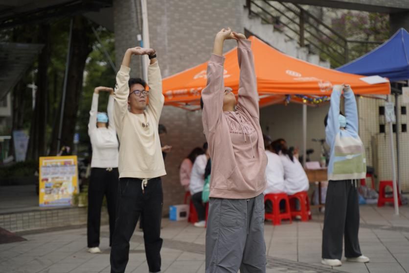 除了中医基础医疗服务外,在邻近饭点,人流量较大时,我校笛箫社的三位成员演奏了一首古韵雅致的曲子《知否知否》,吸引了不少同学驻足欣赏,也为活动增添了几分典雅的气息。为了让大家更好地感受中医文化的魅力并了解养生功法八段锦,邓铁涛学术思想研究协会的同学进行了八段锦教学。同时,我们也邀请了华师的同学一起参与此次活动,舒缓压力,放松身心。