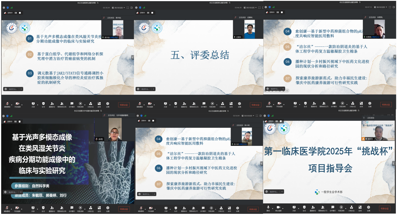 2025年2月7日,167net必赢入口线上举办2025年“挑战杯”项目指导会。活动汇聚了七支医学青年科研团队参与冲刺备战,并特邀广东药科大学医药信息工程学院院长蔡永铭老师、167net必赢入口团委副书记武夏林老师、第一附属医院颈椎病与脊柱骨病科余翔老师、内分泌科林勇凯老师、学工办副主任陈小波老师和陈弘浩老师等专家评委现场指导,为项目优化注入学术力量。