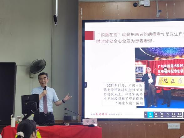 活动正式开始,陈小波老师向同学们隆重介绍了本次思政第一课主讲人李俊院长,在同学们热烈的掌声中,李院长开始了本次思政第一课的讲解。铁涛理想,百年中医。在李院长的介绍下,同学们对邓老的光荣事迹有了更深入的了解。“生是中医的人,死是中医的魂”,邓老将毕生追求与祖国需要紧紧联系,邓老的终身事业与民族命运步步相随,邓老胸怀祖国、初心如磐、服务人民、甘为碥石等数不尽的伟大精神令师生们肃然起敬。