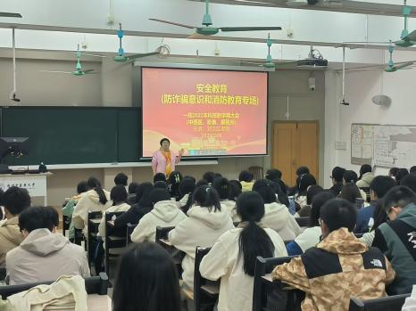 刘老师特别强调安全无小事,从"网络安全""宿舍安全""出行安全"三个层面展开讲解:以本校师生真实受骗案例为切入点,提醒牢记"三不"原则(不轻信、不透露、不转账),提高同学们的防诈骗意识;明确宿舍用电安全,强调人走断电,不可使用大功率电器,结束充电后要及时拔出插头;强调出行安全,筑牢生命底线,将安全意识内化于心,外化于行。