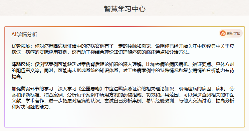 通过动态学习档案实时生成学生知识点掌握度热力图,基于学情分析给学生推荐关联经典条文与临床研究,融合辨证思维、古籍解读、诊疗决策三维度评估学生能力。