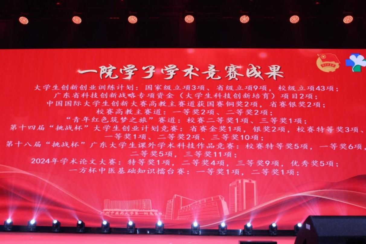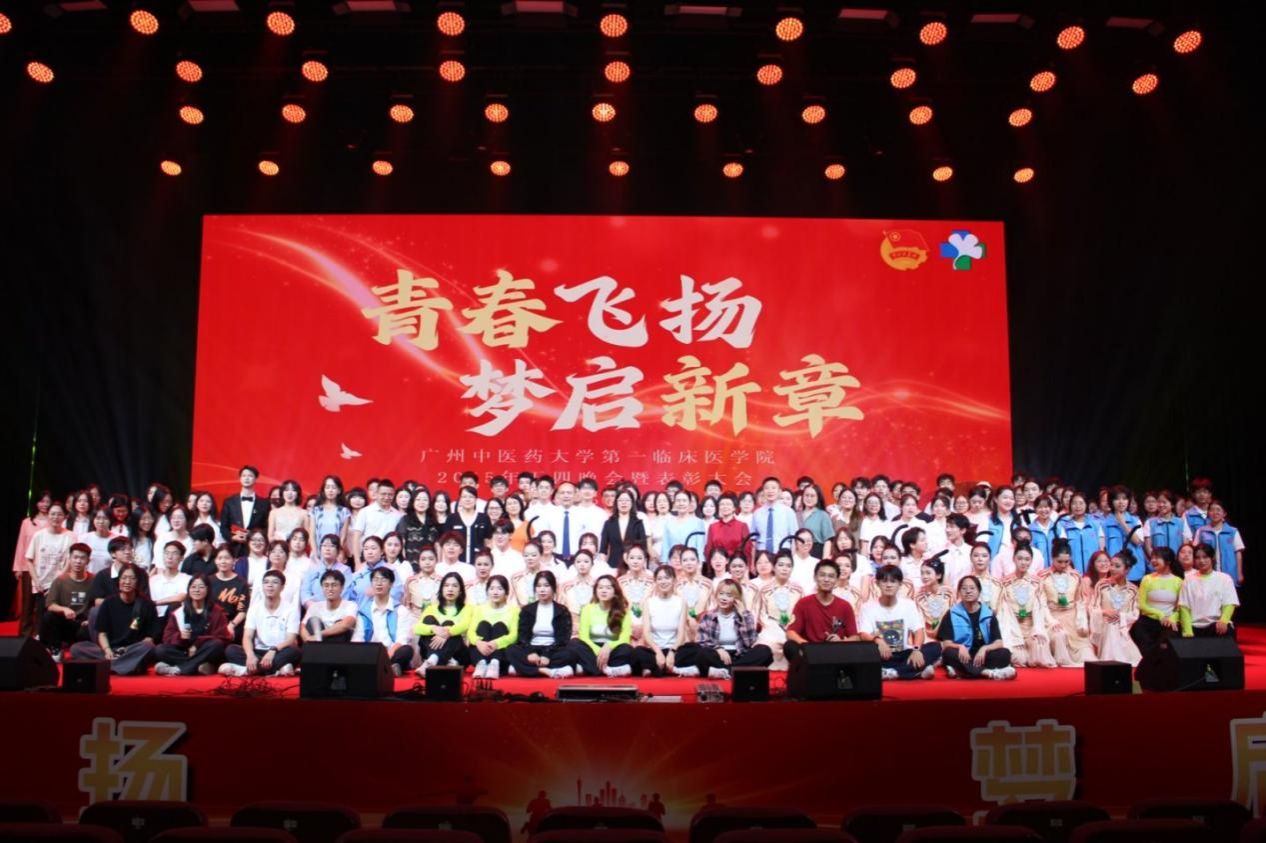在全场热烈掌声中,晚会正式拉开帷幕。一院学子创新设计、精心筹备,以多元节目呈现视听盛宴:2023级临床医学专业陈柯宇带来独唱《有我》,以激昂歌声唱响“强国有我”的青春誓言;2023级与2024级中医学五年制铁涛班联合带来情景剧《杏林长歌-薪火耀岭南》,带领观众领略岭南医派的传奇蜕变,致敬先贤;2023级医学影像学专业同学带来情景剧《五四百年·青春对话》,跨越时空展现不同时代青年的奋斗图景;2024级中医学五年制专业同学合唱《世界赠予我的》,琴声与歌声交织传递温暖力量;云梦艺术团舞剧《玉鸟》以良渚文化为灵感,演绎人与自然的和谐之美;2024级临床医学专业同学带来光影剧《过去·未来》,诠释时代精神的接力与传承;特邀嘉宾FIT-HOT街舞协会带来《七彩玻璃》,用动感舞步展现青春活力。