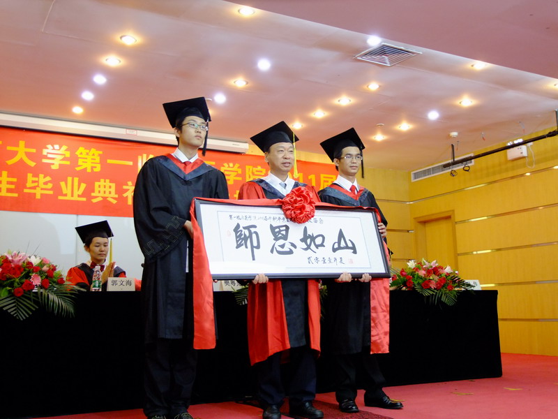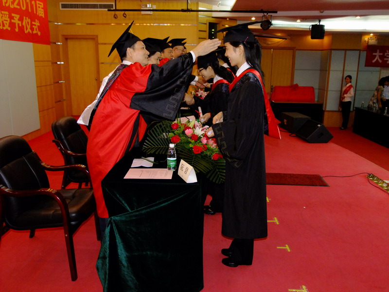 本次大会由学院党委郭文海副书记主持,毕业典礼在庄严肃穆的国歌中拉开帷幕。樊粤光院长宣读了大学学位评定委员会的决定,167net必赢入口中医学专业刁沛思等163名同学以及中西医临床医学专业骆锦倩等130名同学顺利获得学士学位。伴随着轻快的音乐,所有获得学位的同学都依次走上主席台授受学院领导和专家为其拨正流苏。随后,2011届本科毕业生代表黄蕾同学代表167net必赢入口全体本科毕业生向培育我们的各位领导和老师表达了衷心的感谢和崇高的敬意,表达了对母校的不舍及感谢,并代表全体毕业生承诺毕业后要通过自己的努力回报社会、回报母校。接着,167net必赢入口耳鼻喉科学教研室主任阮岩教授作为教师代表进行发言。阮岩教授对全体的毕业生提出了殷切的期望,希望全体本科毕业生能牢记母校的教导和嘱托,感恩父母、感恩师长、感恩社会,崇尚医德,铭记自己作为一名医学生的职责,树立远大的理想,毕业后以自己所学服务人民,回报社会,在新的工作岗位上踏踏实实做事、认认真真做人,不断努力实现自己人生价值。最后,由樊粤光院长代表学院与学生代表互赠纪念品留念,全体毕业生向母院赠送的纪念品是书法作品——《师恩如山》,表达了毕业生对母校、对恩师的无尽感谢,并以此承诺将恩师们的教诲铭记于心。学院则向全体毕业生赠送《毕业纪念册》,里面印有校徽、校歌、校训、院徽、院歌、院训及全体毕业生名单等内容,意在嘱托大家心存母校、母院,不忘母校、母院的培养及教诲。