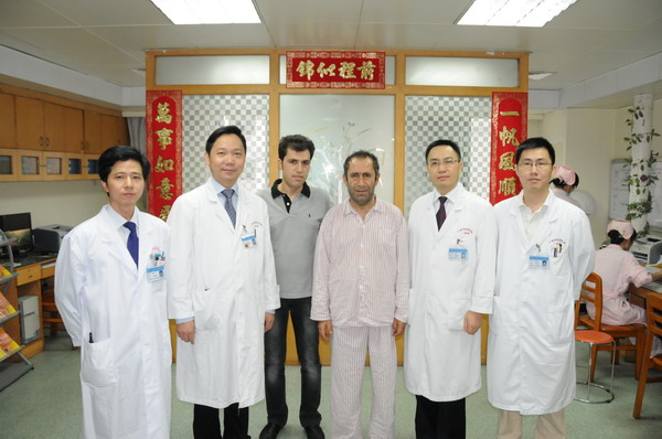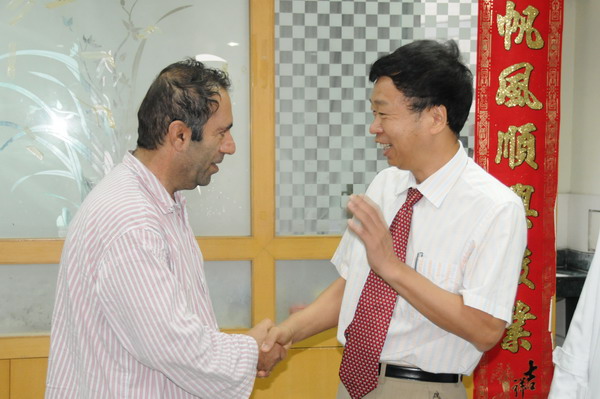 2011年11月11日清晨,天刚朦朦亮。一位五十开外的中年男士在住院中心楼的走廊巡视。他发现北楼一楼介入中心灯火通明。于是他走进一楼大厅,见到一名外籍男子在手术室外焦急徘徊。他上前问道:“Morning!What’s the matter with you?” 外籍男子回答:“My old brother suffered from acute myocardial infarction suddenly before dawn,the docotors said it’s very dangerous disease,and I’am very anxious.He is my only immediate relative in china, he is undergoing operation of PCI in the operating room.We are from Iran.”正在抢救的心血管科医护人员发现,这位中年男士不是别人,正是我们的院长樊粤光教授!平时他习惯于清晨就来医院巡查。樊院长一直观看手术直到手术圆满结束。他走出手术室亲切地握着病人家属的手说:“The intervention operation is successful,congratulations!”他的安抚立刻打消了患者家属的担忧。患者家属非常感激地说:“Thanks to the doctors, they rescued my old brother, thank you very much!”