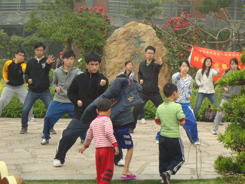2012年3月3日15点,09中西医团支部的同学们在附院花园向周围群众和就医的病患展示、教习了养生健身操——八段锦,受到群众欢迎。