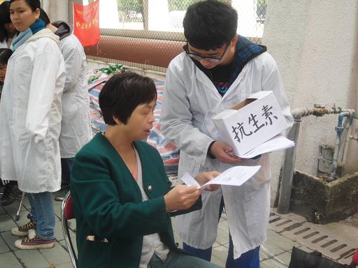 除常规的拔火罐、艾灸、推拿、耳穴、量血压等义诊活动外,本学期的周末社会实践活动中还增添了一项新项目——“合理使用抗生素,全民健康齐参与”知识有奖竞猜。活动一开始,我们的“宣传员”便带着厚厚一叠宣传单,走入人群中宣传抗生素使用的相关知识。想必宣传的效果不错,许多人在接受完我们的常规义诊活动后,主动参与了抗生素有奖竞猜活动。
