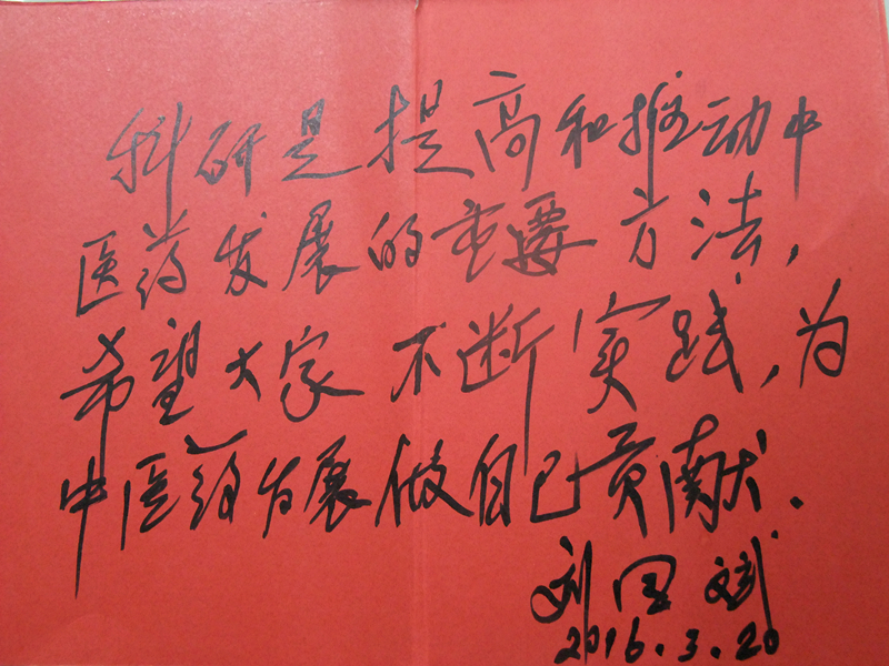 讲座最后,刘教授为第十届基础科研培训班作了开班题字,对一院学子寄予厚望:“科研是提高和推动中医药发展的重要方法,希望大家不断实践,为中医药发展做出自己的贡献。”