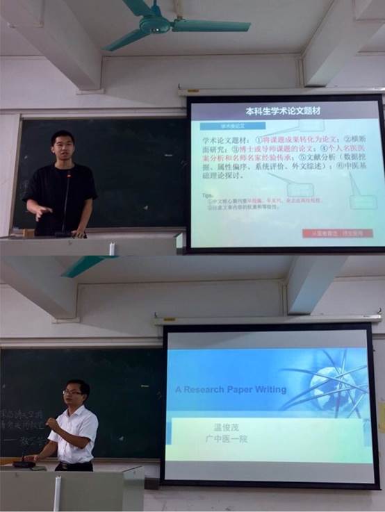 2017年9月21日上午11时,14中医实验班有幸邀请到两位学术大咖——黄超原师兄和温俊茂师兄为我们进行论文写作讲座,辅导员邱敏老师也亲临现场主持此次班会,与我们一同聆听分享。