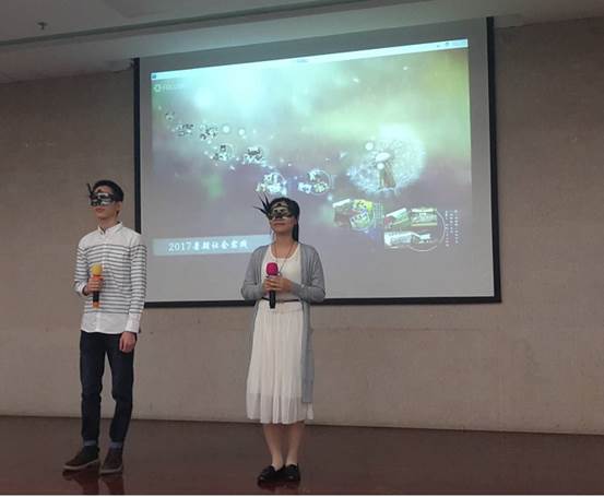 随后便迎来了本次大会的高潮部分——揭晓在本年度暑期社会实践活动中获奖的优秀团队。现场以“火眼金睛找错字、寻字条”有奖竞答的方式揭晓了荣获优秀奖的队伍;三等奖获奖队伍则分别用“看图猜字”“拆文解字”的方式揭晓;在生动形象的网络表情中,二等奖获奖队伍呼之欲出;最后,在主持人铿锵有力的颁奖词中揭晓了获得一等奖的“福铃队”。福铃队代表通过精彩的活动总结视频展示了他们丰富多彩、形式多样的活动。