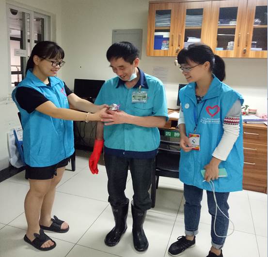 患者们收到礼物后很开心。记得我们刚刚把载满礼物的车子推进病房时,患者们都探过头来看,问我们这是什么。我们笑着把礼物给他们后,整个病房都变得欢乐起来了。这让我深刻地感受到了作为志愿者的乐趣:在带给别人快乐的同时自己也很快乐。我想,我们就如同一针强心剂,带给患者心灵上的慰藉,又如一束阳光,照亮他们的心房,也许这就是人文关怀的魅力吧(林书馨)