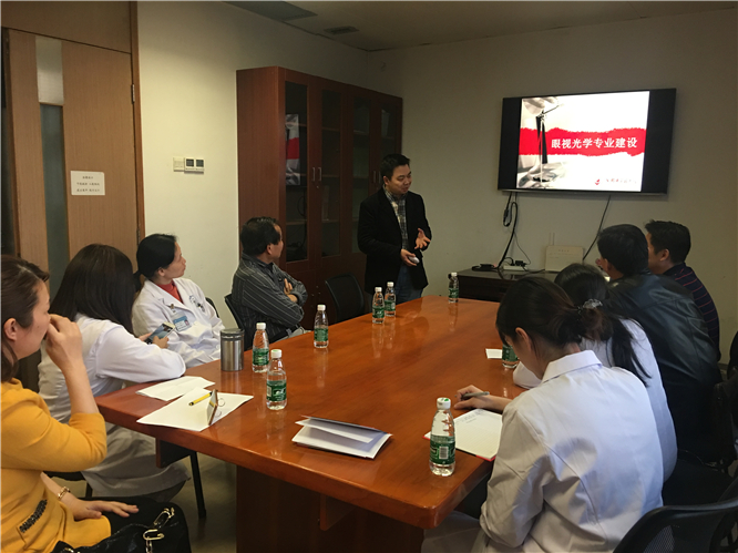 在欠缺专业办学经验的情况下,167net必赢入口眼科俞晓艺主任高度重视,力求为新专业的前期建设打下扎实的基础,不仅在科室人员紧张的情况下安排专人去国内一流的眼视光学院-----温州医科大学进修,更是博采众长,于近日特邀了中医药系统的兄弟院校------成都中医药大学眼视光专业主任周春阳教授,来167net必赢入口眼科与全体医务和教学人员进行了面对面的专业建设经验交流。