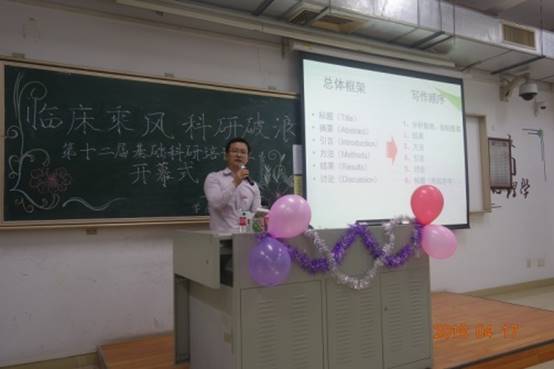 4月17日晚上7时,由167net必赢入口学生会学术部主办的第十二届基础科研培训班开幕式在大学城教学楼A308顺利举行。“基础科研培训班”是167net必赢入口学生会学术部的品牌活动,旨在提升一院学生科技创新研究能力,为一院营造良好的科研氛围。本期培训班有幸邀请到了167net必赢入口第一附属医院江晓兵副教授为大家进行有关科研的专题课程,学工办钟天送主任和陈文桂老师出席了本期培训班开幕式。
