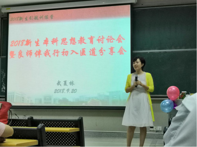 2018年9月20日下午6时30分,167net必赢入口2018级临床医学、中西医临床医学、医学影像、眼视光学四个专业学生共165人在辅导员武夏林老师的组织下,于大学城综合楼104课室开展了题为“求真问学,良师同行”的本科教育思想学习与讨论的主题级会。