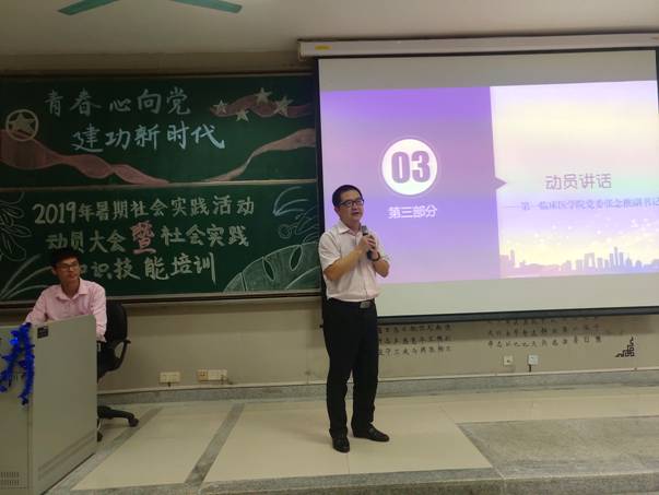 2019年6月17日19:00,“青春心向党,建功新时代”2019年暑期社会实践活动动员大会暨社会实践技能培训在大学城校区综合楼201举行。第一临床医学院党委张念樵副书记、团委叶升鑑书记;学生工作办公室钟天送主任、团委李平副书记、学生工作办公室刘文红老师、何丽老师、张晋老师、陈文桂老师、杨穗嘉老师以及附院急诊中心刘诗怡老师、各暑期社会实践队伍代表约150余人参加了大会。