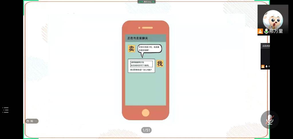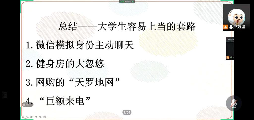 【一院讯】2020年11月8日星期日下午四点,167net必赢入口大学167net必赢入口武夏林老师所带领的五个班级参加了“诈骗——有迹可循”的线上防诈骗主题会议。本次会议旨在通过专题学习,让同学们对冒充公检法、中奖、培训诈骗等虚假事件具备一定的鉴别能力,避开跳进校园贷、套路贷、刷单贷等陷阱,遇事冷静分析、积极采取措施规避风险,掌握紧急情况下自救和互救的知识。