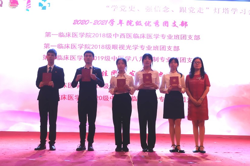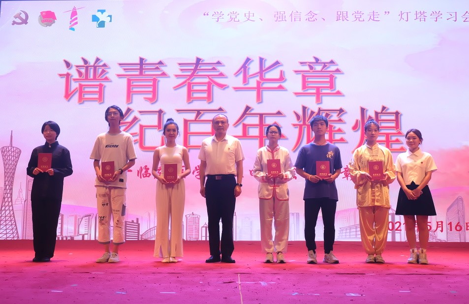 晚会现场还进行了党史知识互动问答,从同学们踊跃的回答中,我们看到了同学们在校、院、团支部各项党史学习教育中所取得的学习成果。最后,是演出节目的表彰环节,章遐义老师为获奖单位进行了颁奖。20铁涛团支部获一等奖,20中八九团支部、云梦艺术团舞蹈队获二等奖,19临床团支部、19中五团支部、19眼视光团支部获三等奖。