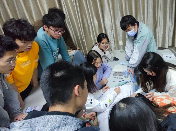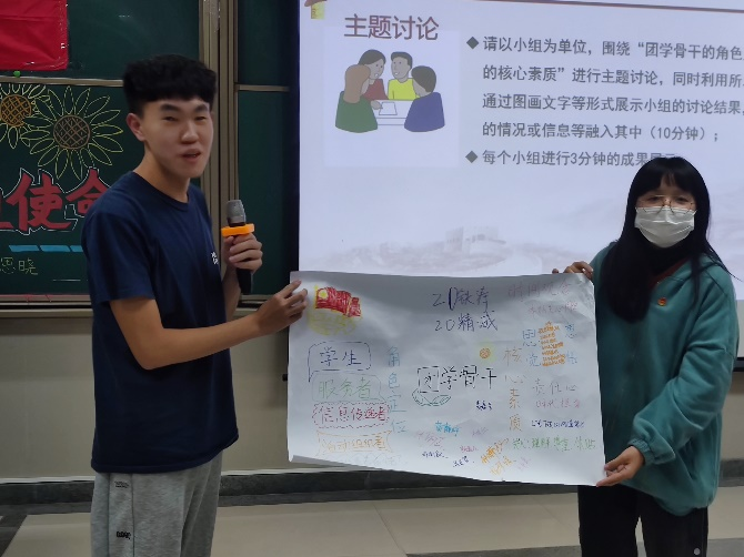 接着,池老师通过近年来团学骨干的一些舆情新闻事件引发学员们的思考,邀请大家围绕“团学骨干的角色定位及所应具备的核心素质”的主题开展小组讨论,并以小组为单位借助白纸、彩笔呈现小组讨论的结果。现场气氛达到高潮,各小组热烈讨论,分工协作,你一笔我一画创造小组的思想结晶。短短十分钟的时间,各小组完成任务并争先恐后上台展示成果,各组精彩的分享引来了现场阵阵掌声。结合大家展示的情况,池老师明确指出了团学骨干的角色定位首先是学生,是‘服务者’不是‘领导者’,是榜样,是广大同学的代言者。她还从“思想政治素质”、“智能素质”、“健康素质”三大方面入手,与大家一同交流一名合格的团学骨干所应具备的核心素质。随后,池老师通过视频与同学们介绍了时代楷模、“七一勋章”获得者黄文秀的先进事迹,并结合自己在黄文秀生前工作地广西百色乐业县百坭村的下乡经历,鼓励同学们要学习黄文秀不忘初心、心系民众,在脱贫攻坚道路上勇担使命、舍我奉献的精神。最后,为了引领学员们做到“学思践悟,奉献于行”,池老师邀请了“百色筑梦”志愿服务队队长简心悦,以及获得本学期青马工程“我为母校师生办实事”实践活动一等奖获奖小组代表张雨露、黄静婷上台分享组织实践活动、带领同学们一起为乡村百姓、为身边师生办实事的体会。在场的学员们也被分享者所感染,纷纷表示在未来一定要积极投入志愿服务中,以行动为母校、为祖国的发展贡献一份力量。