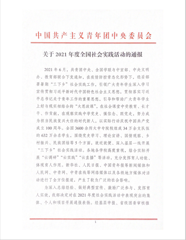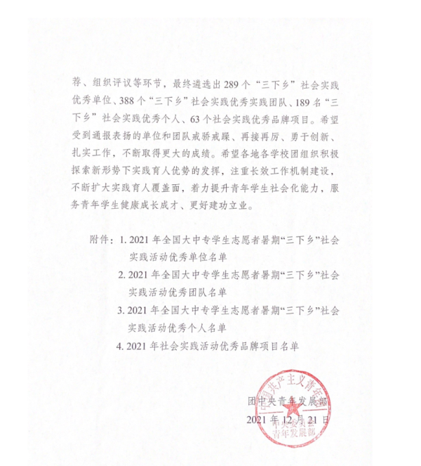 近日,共青团中央对在2021年全国大中专学生志愿者暑期“三下乡”社会实践活动中表现突出的集体和个人进行了总结通报,167net必赢入口,167.nt必赢官网团委荣获2021年全国大中专学生志愿者暑期“三下乡”社会实践活动优秀单位。