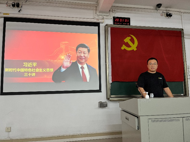 会议的第一议题是学习习近平新时代中国特色社会主义思想,由党支部第一小组庞凤祥组长进行领学。小组成员在会前认真备课,形成PPT课件,现场向大家系统介绍了习近平新时代中国特色社会主义思想的内容、历史意义和启示,加深了同学们对理论的认识和理解,坚定了坚持党的领导的信心和决心。深刻认识到习近平新时代中国特色社会主义思想是我们党理论创新的最新成果,是当代中国的马克思主义、21世纪的马克思主义。把习近平新时代中国特色社会主义思想作为党必须长期坚持的指导思想,对在新的历史起点上进行伟大斗争、建设伟大工程、推进伟大事业、实现伟大梦想具有重大现实意义和深远历史意义。