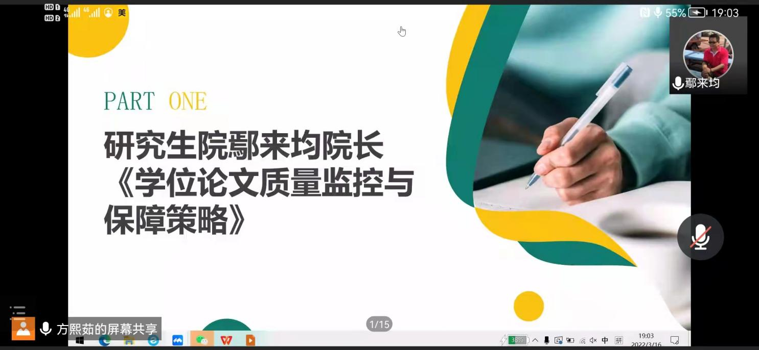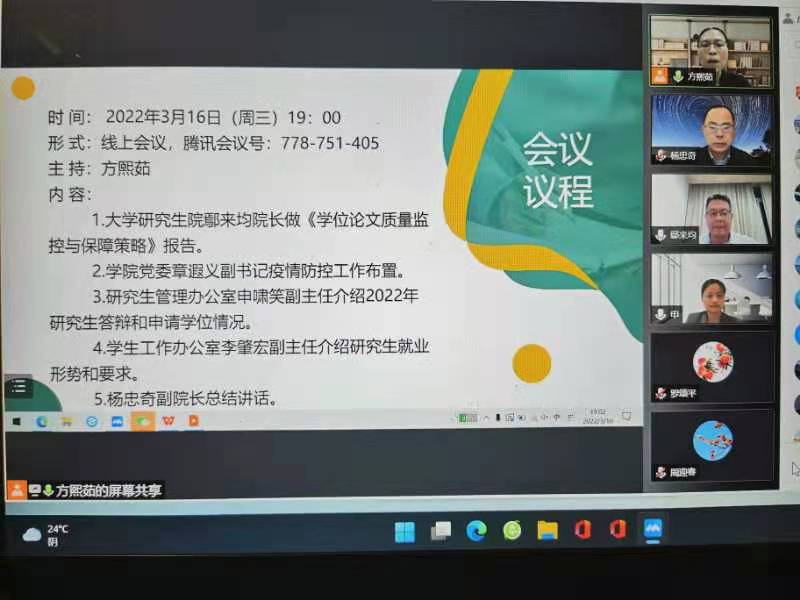 会议分四个议程,首先由大学研究生院鄢来均院长向全院导师进行《学位论文质量监控及保障策略》的专题讲座;接着由章遐义副书记对当下疫情防控工作向全院导师提出要求,切实加强对研究生在疫情防控常态化下的日常管理;随后,研究生管理办公室申啸笑副主任向全院导师介绍了2022年研究生毕业和申请学位的相关情况;然后,学生工作办公室李肇宏副主任传达了上级关于2022年毕业研究生的文件精神和要求,并向导师介绍167net必赢入口就业工作方案。最后,学院杨忠奇副院长与全体导师一起学习了教育部印发的《研究生导师指导行为准则》,要求全体导师要切实强化导师第一责任人的职责,高度重视并落实今晚培训的内容。