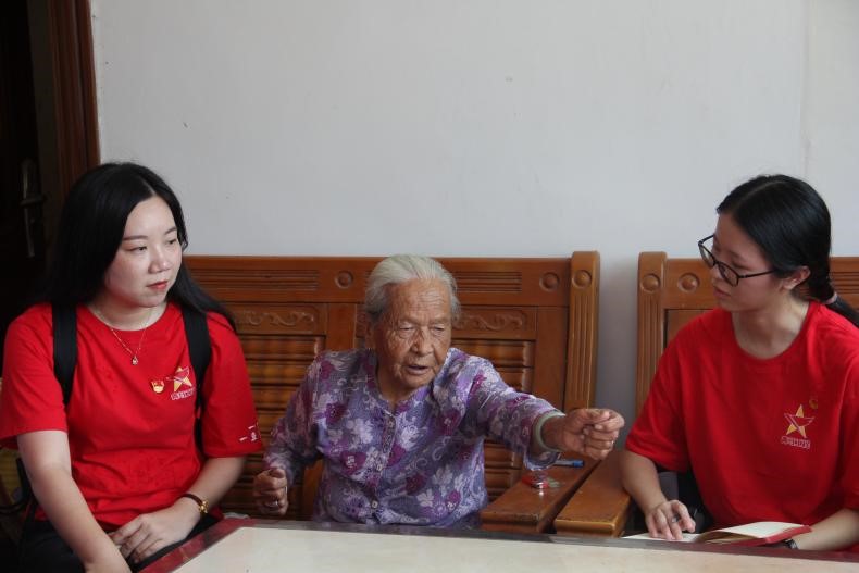 张奶奶已经88岁高龄,她在孩童时期便见证了岭南大学、东吴大学等高校的搬迁。忆起那段充满辛酸的峥嵘岁月,谈起那段校村相依的美好过往,张奶奶情不自抑。据张奶奶回忆,在那个战火纷飞、物资匮乏的年代,岭南大学和东吴大学先后搬迁到大村寻找办学地点,大村划分给学校大片土地作为教学场地,用泥巴、竹子等材料搭建起简陋的书舍、饭堂和医务室等,为师生提供了一个安静有保障的教学场所。张奶奶还与队员们分享了当时的师生故事,谈起岭南大学校医黄四姑时,张奶奶提到“她脾气很好,人很好很好的,村民来看病她都不收一分钱,老人和小孩都不收钱”,师生和村民团结一致、互相扶持、大爱无私的感人校村情谊让在场的队员们为之动容。