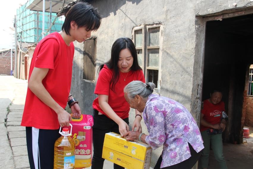 (学生团委书记池思晓与志愿者为张六凤老人送上慰问品)