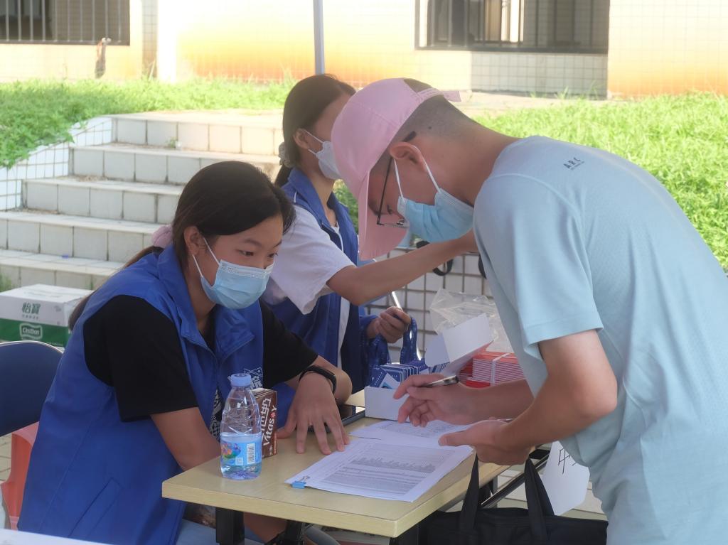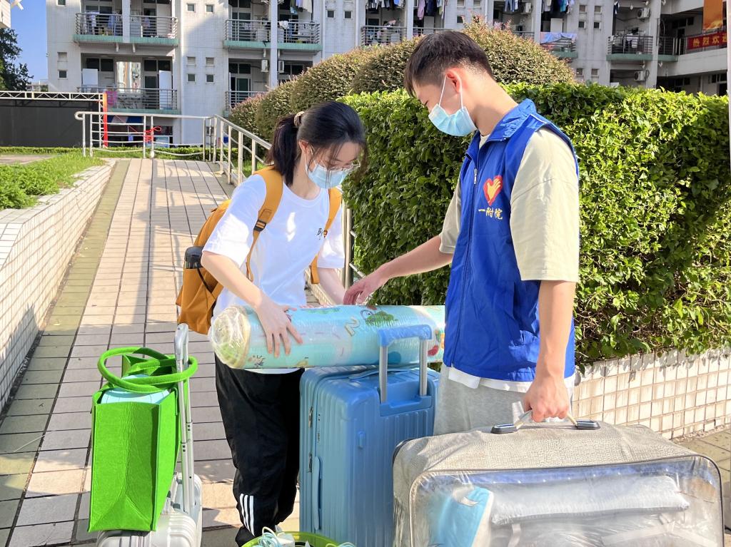 上午8时许,一院新生陆续准备入校。一院学生会分别在校园入口、大本营、D栋宿舍楼、E栋宿舍楼、第二饭堂、K栋宿舍楼设置了新生服务点。校园入口的志愿者从新生家长们手中接过大件行李,并指引新生们按照规定的防疫程序进入校门,前往一院大本营。大本营工作人员协助新生办理各种手续,并送上精美的一卡通与资料袋。其后,各服务点的搬运志愿者前后接力,确保将新生行李一件不落地安全送达新生宿舍。
