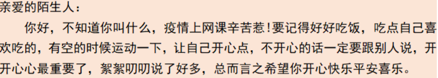 本次线上主题宿舍活动包含三个各具特色的小活动,分别是“温情问候暖心田”一次来自陌生人的温暖问候活动、“一见钟‘寝’”宿舍创意集体照/视频制作活动和“生活小确幸”日记打卡活动。在167net必赢入口学子的积极参与下,活动顺利开展并取得了良好的效果。言轻而意重,陌生却温暖,同学们用温暖的文字表达对陌生人的美好祝福,感受这世间莫大的善意;感知小美好,享受小满足,同学们用日记记录在疫情封校生活中的点滴,倾听生活的心声;多彩生活,搞怪创意,同学们用照片或者视频定格属于他们的美好瞬间,愿往后依旧不负韶华,一往无前。